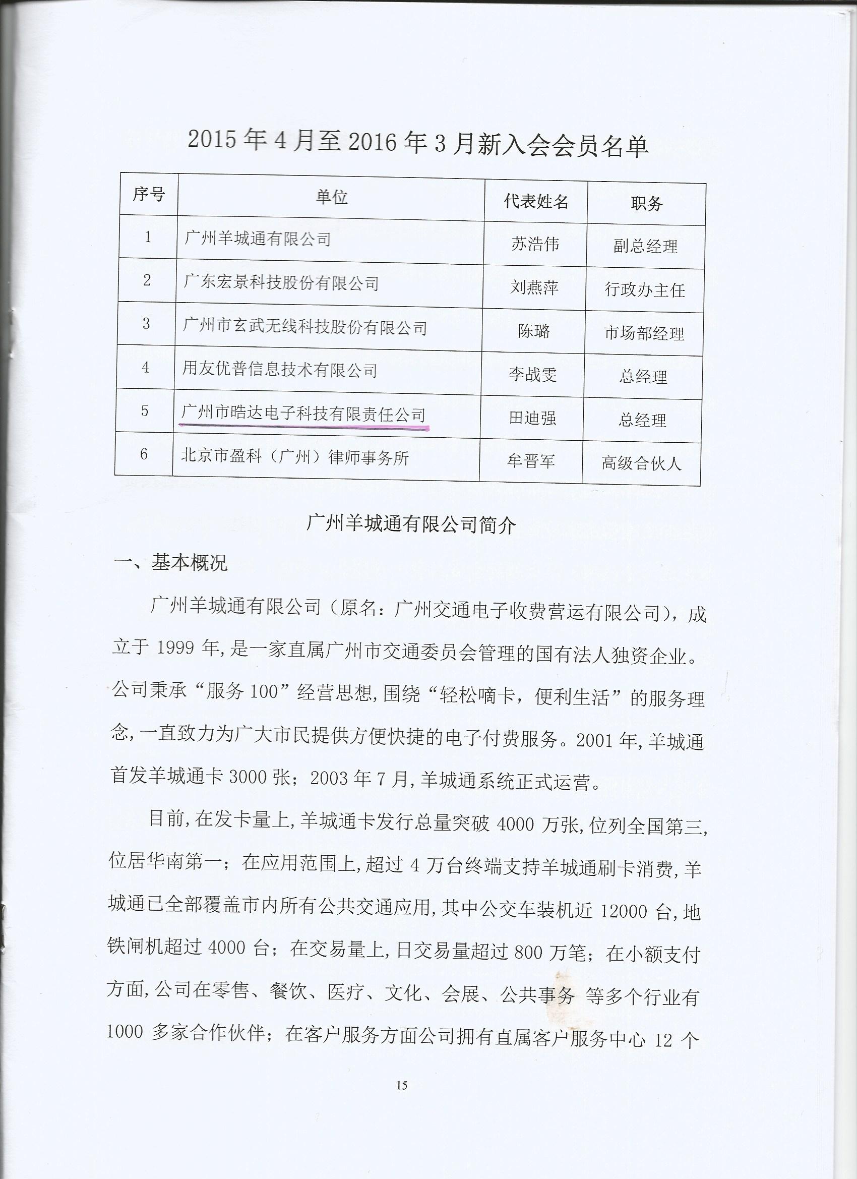 大会审议通过广州市晧达电子科技有限责任公司、广州羊城通有限公司、广东宏景科技股份有限公司、广州市玄武无线科技股份有限公司、用友优普信息技术有限公司、北京市盈科(广州)律师事务所等6家单位为新入会会员。